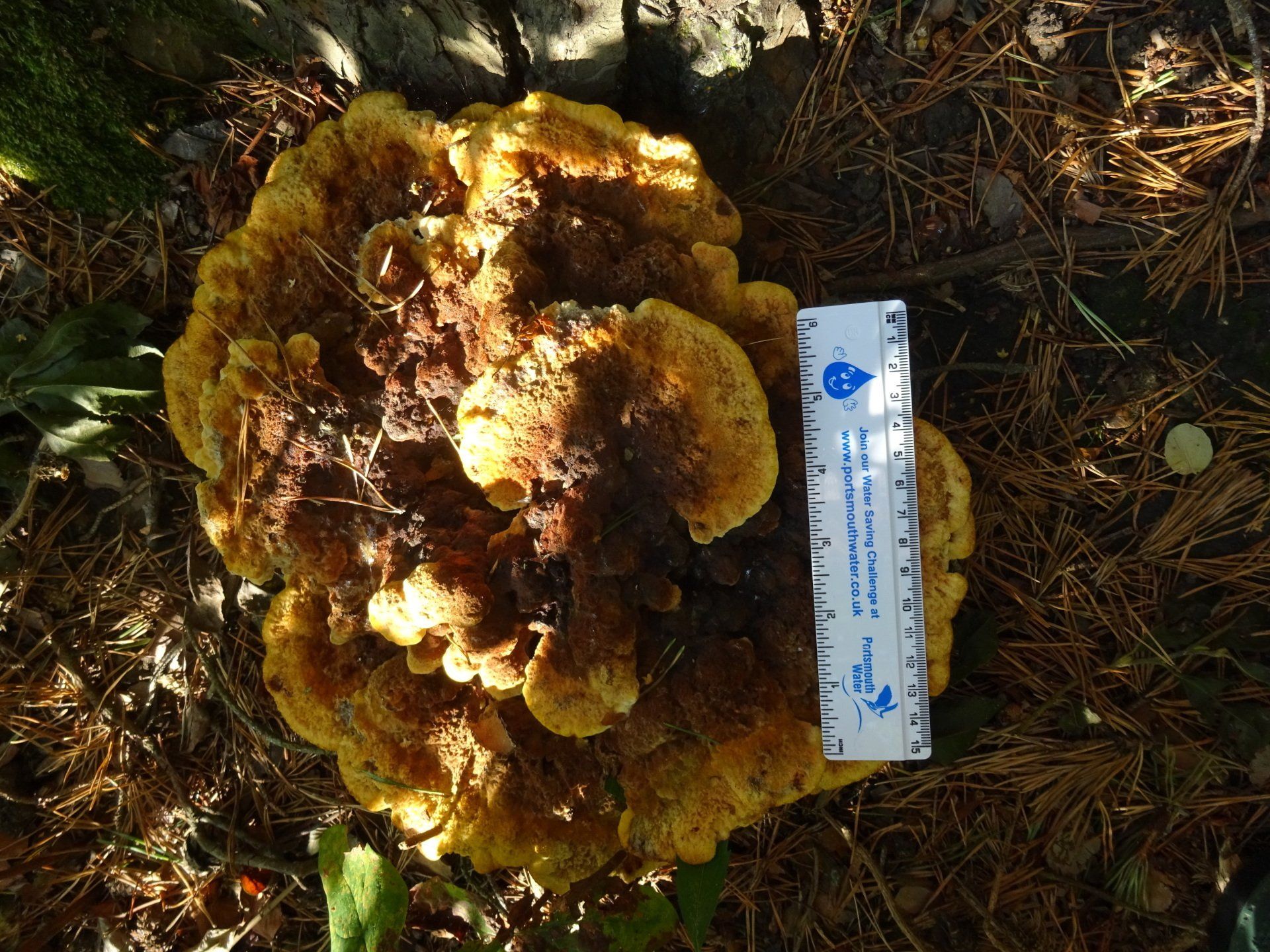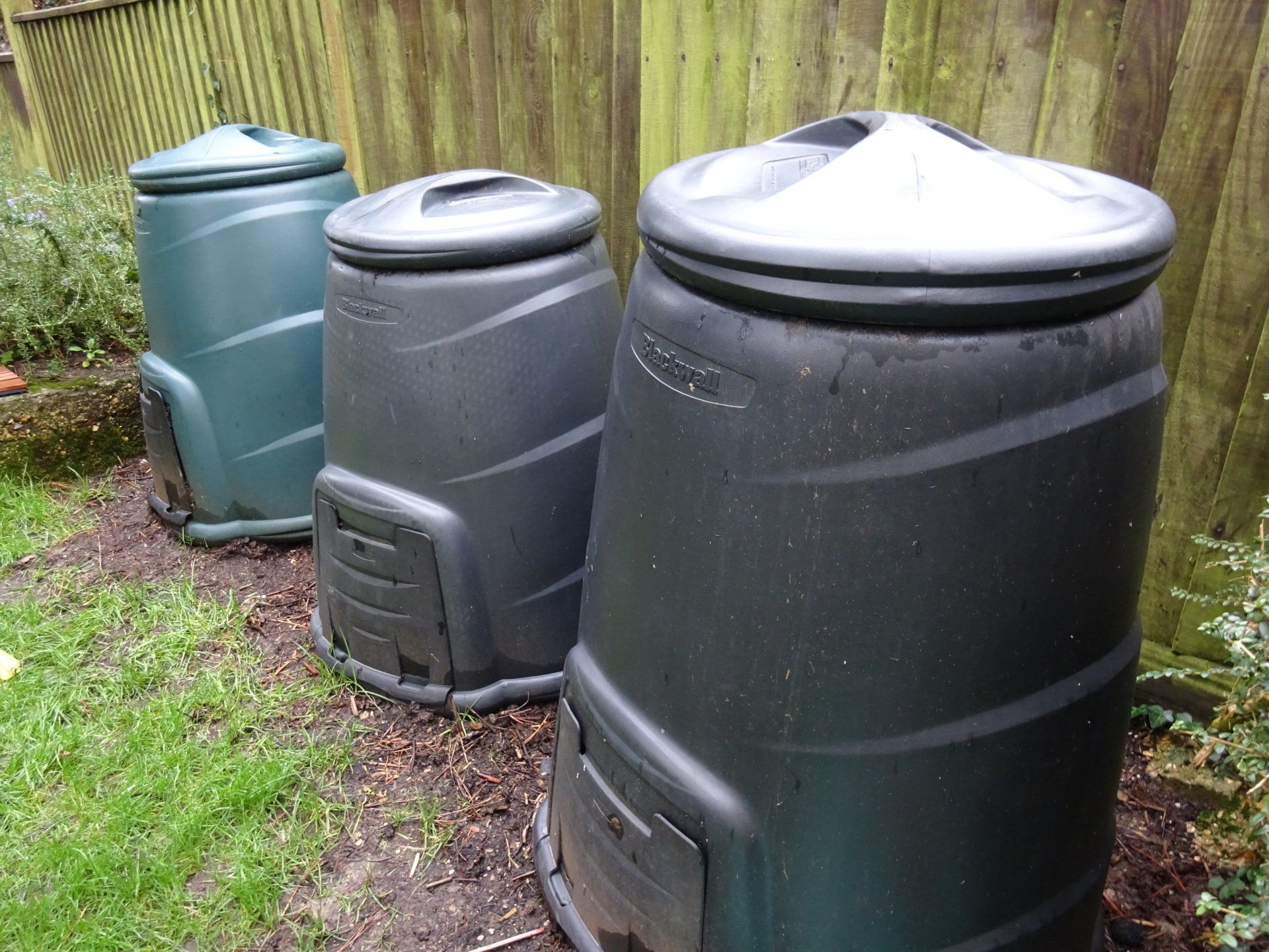 Above left to right: Dyers Mazegill, a serious fungus which fortunately only affects conifers; willow tree planted to reduce waterloggin; log pile (provides shelter for beneficial hibernators such as toads which in turn eat slugs, and a home for insects which attracts birds); 3 bin system for compost and mulch
